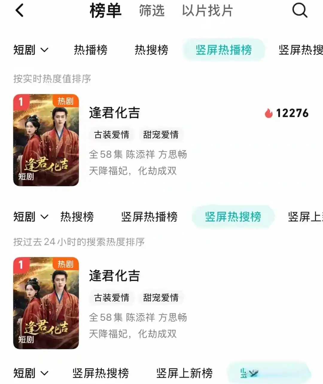 《逢君化吉》在腾讯首播当日热度破万,一举登顶腾讯视频短剧竖屏热播榜、热搜榜以及飙升榜三榜第一,仅开播24小时播放量突破5000万大关,可以说成绩十分亮眼。